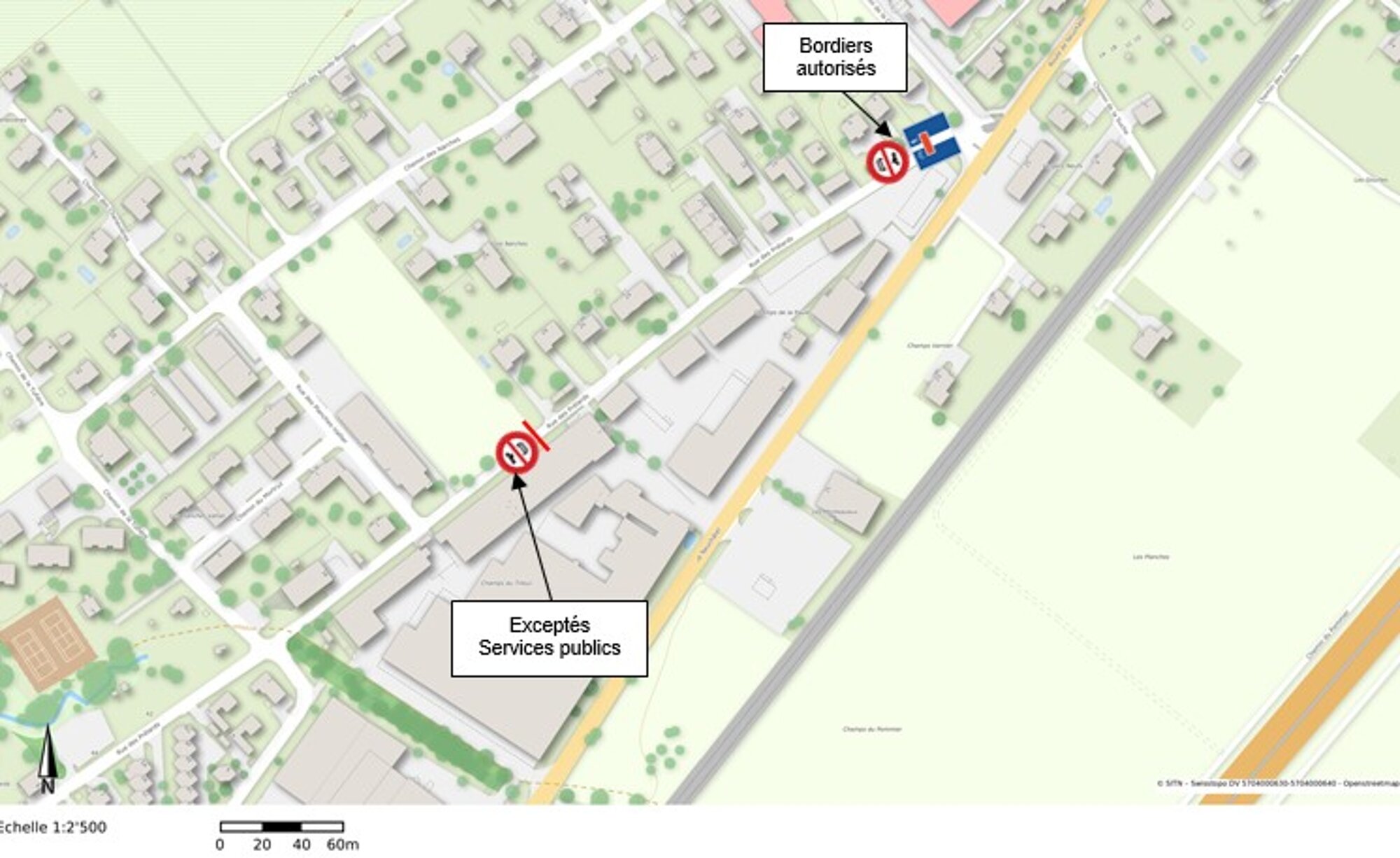 Nous encourageons vivement les automobilistes venant de l’Ouest du village à emprunter le Ch. des Malpierres et la RC5 pour se rendre en direction du centre et de l’Est du village.